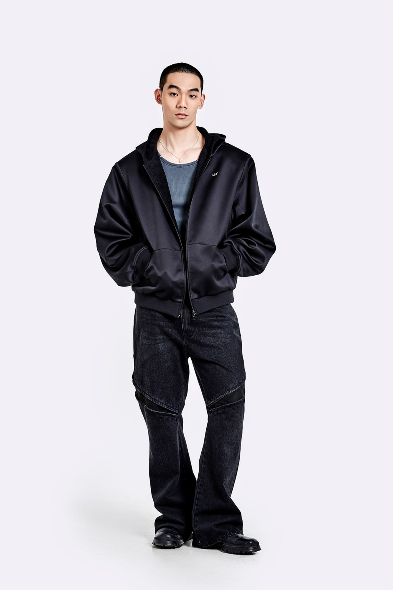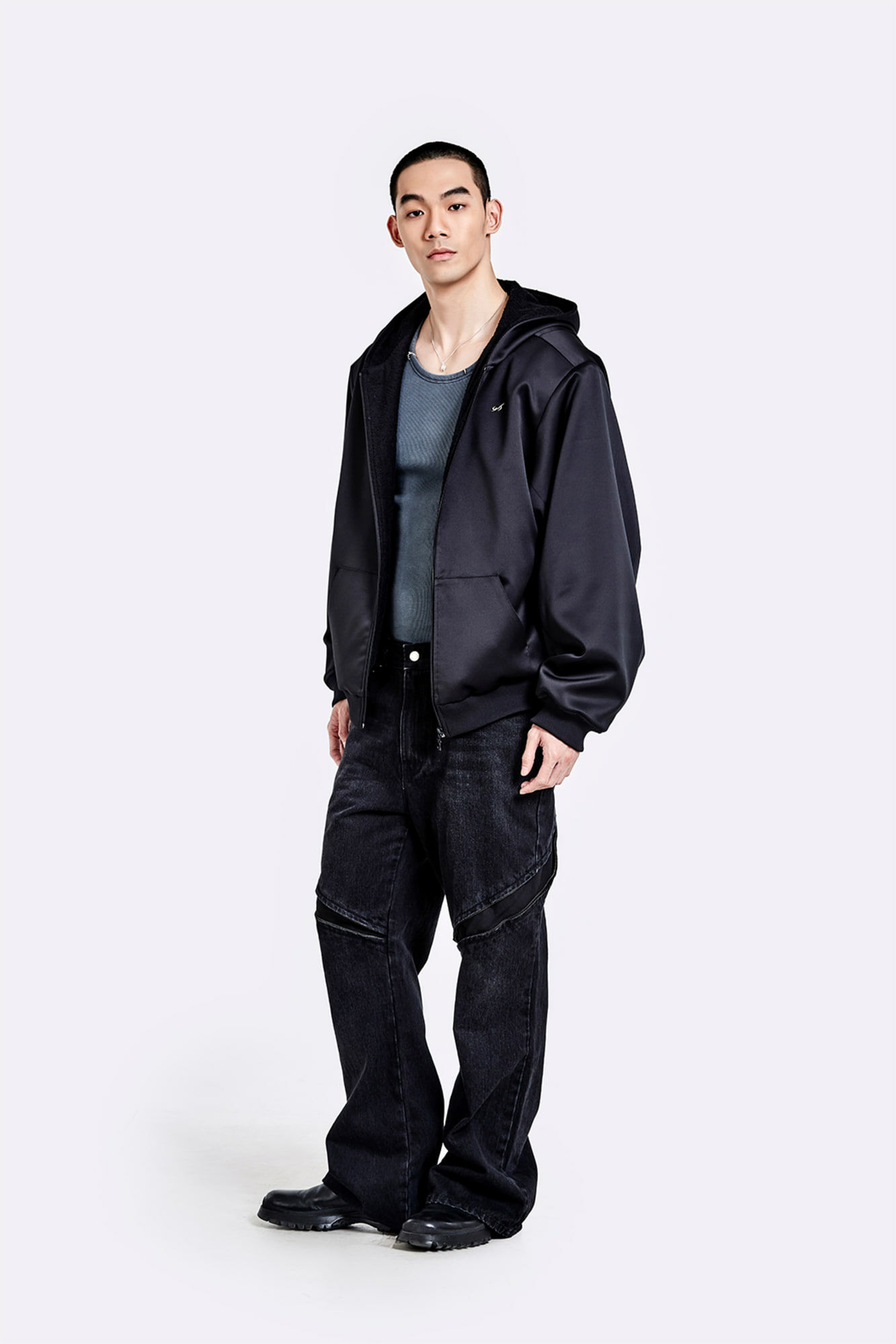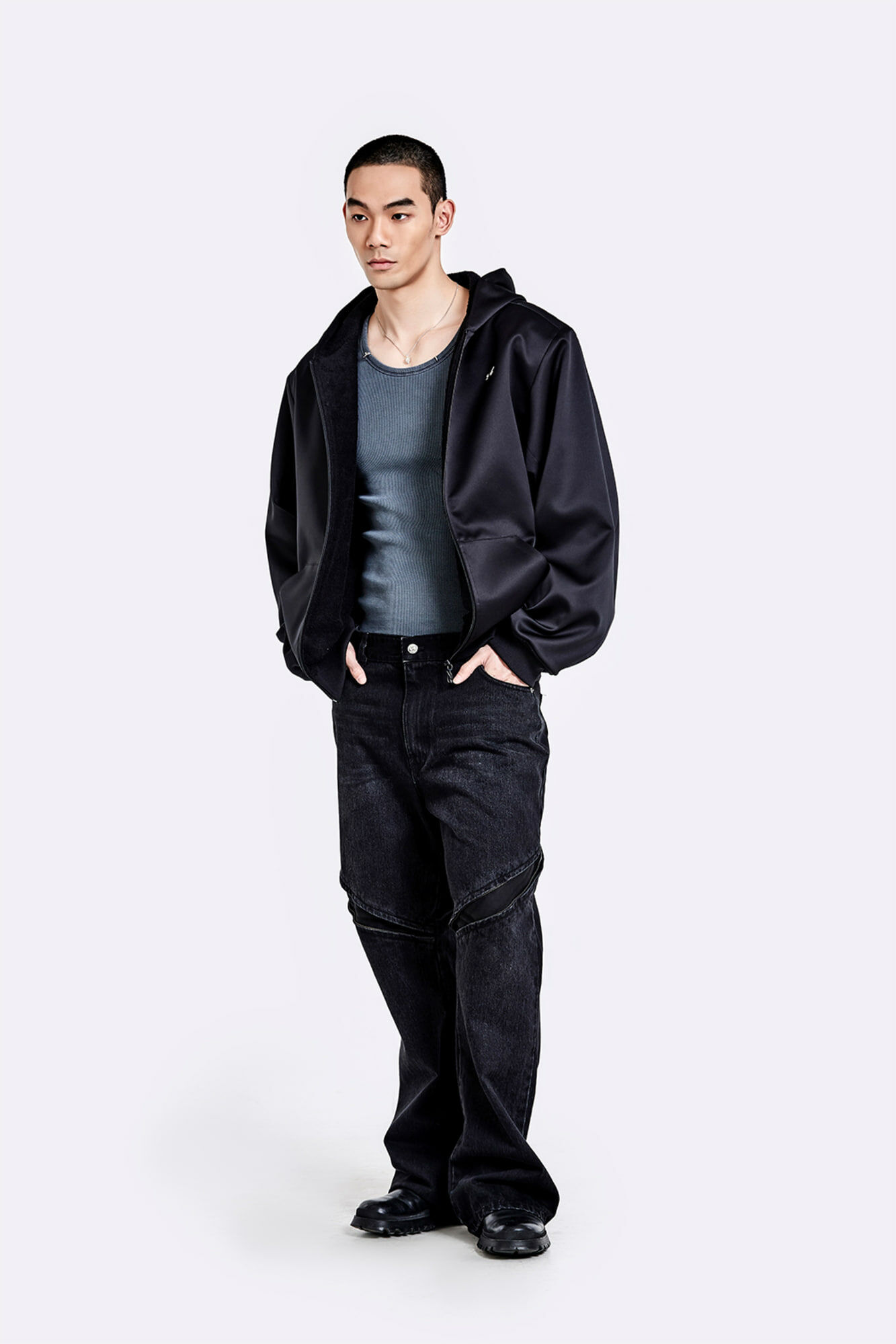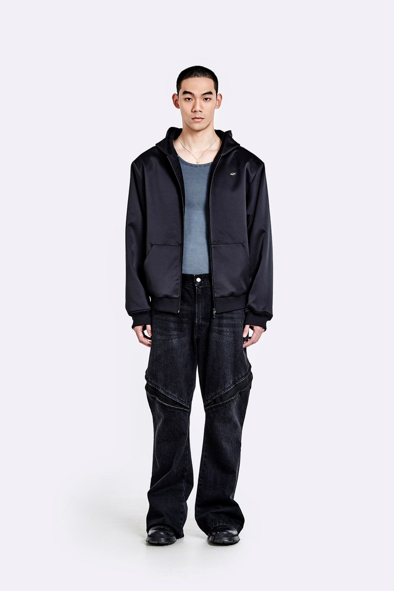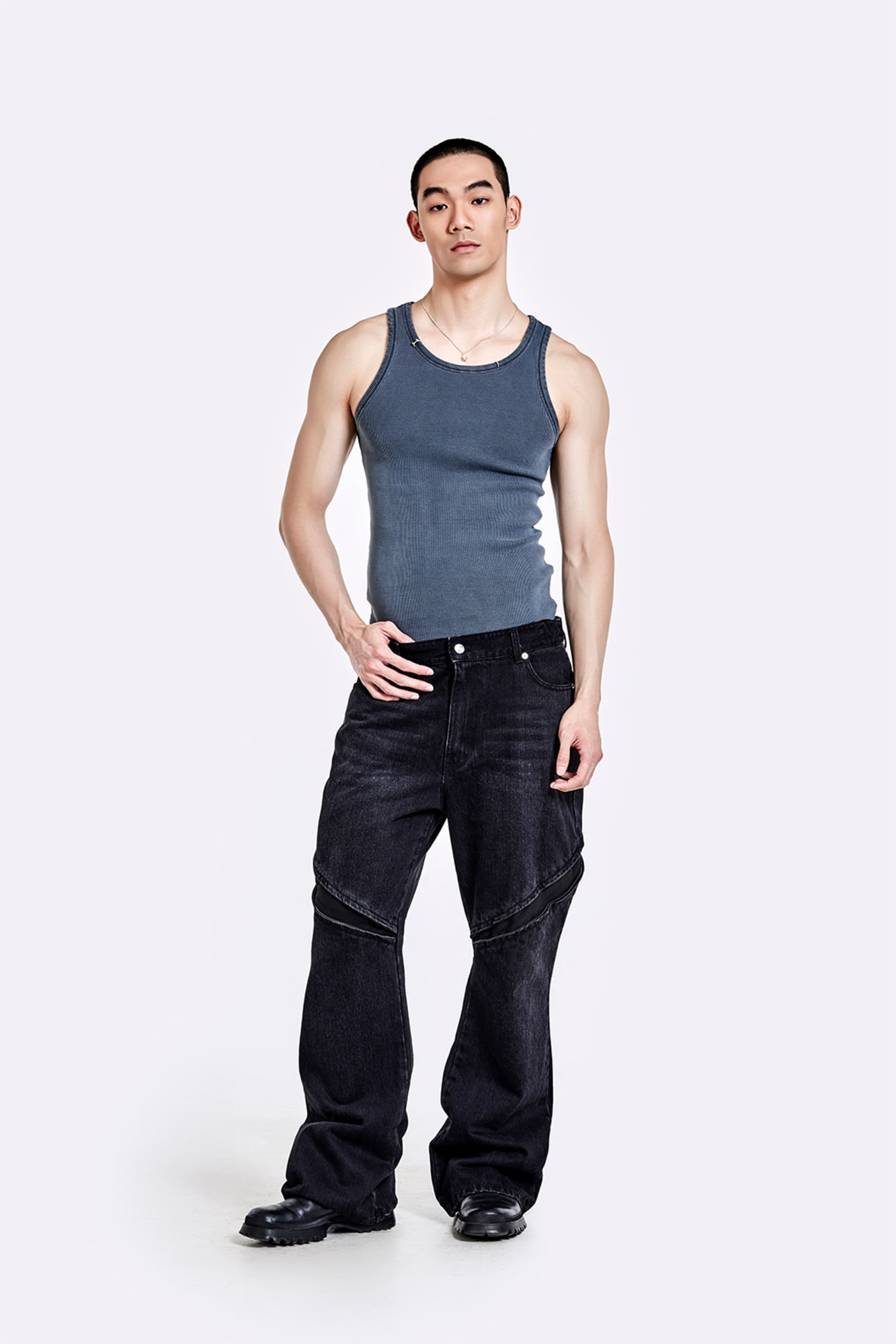 金屬環領背心 - 水洗灰